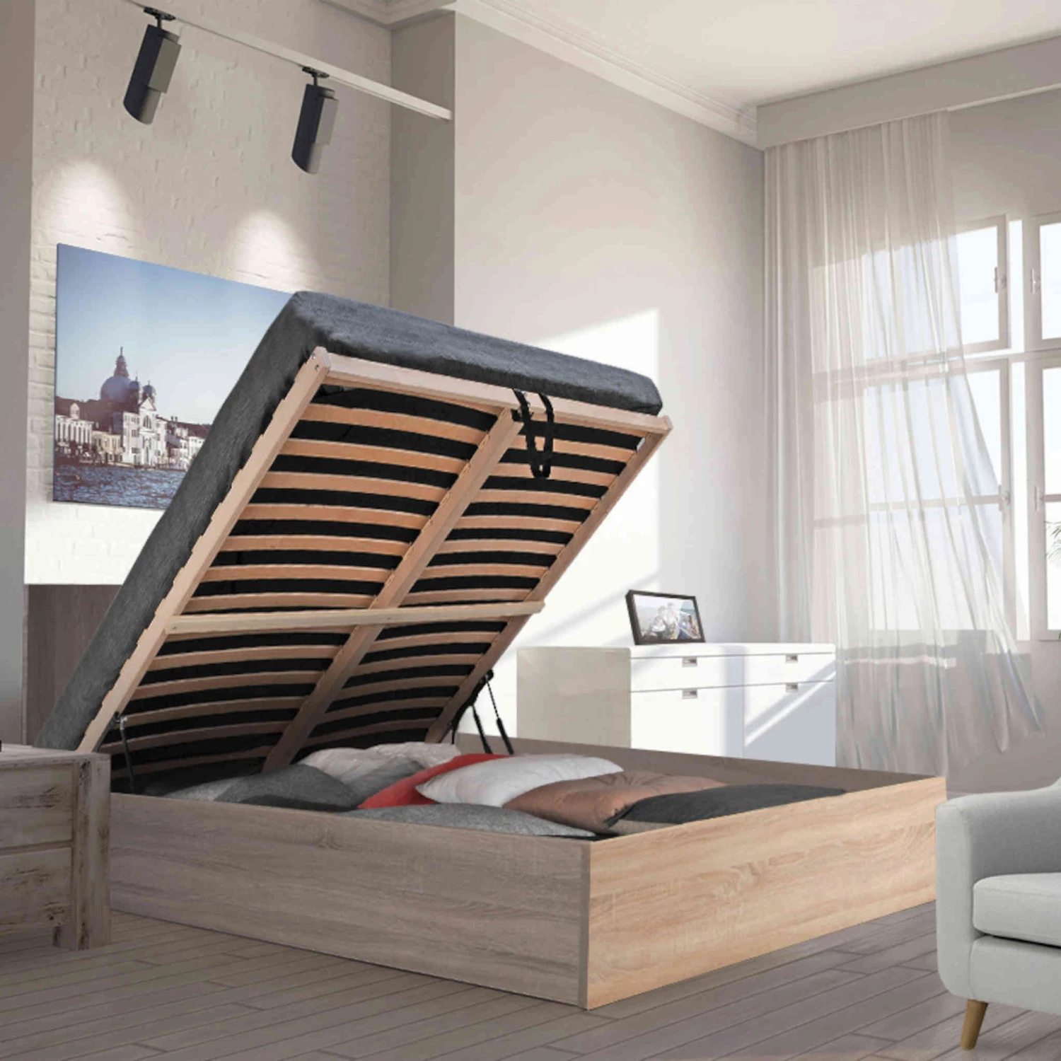 Lit coffre avec sommier en bois imitation chêne clair – LT14022