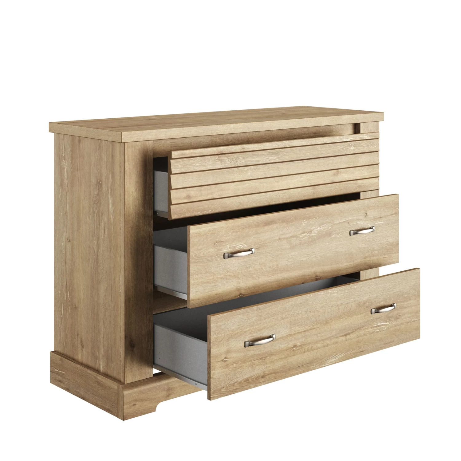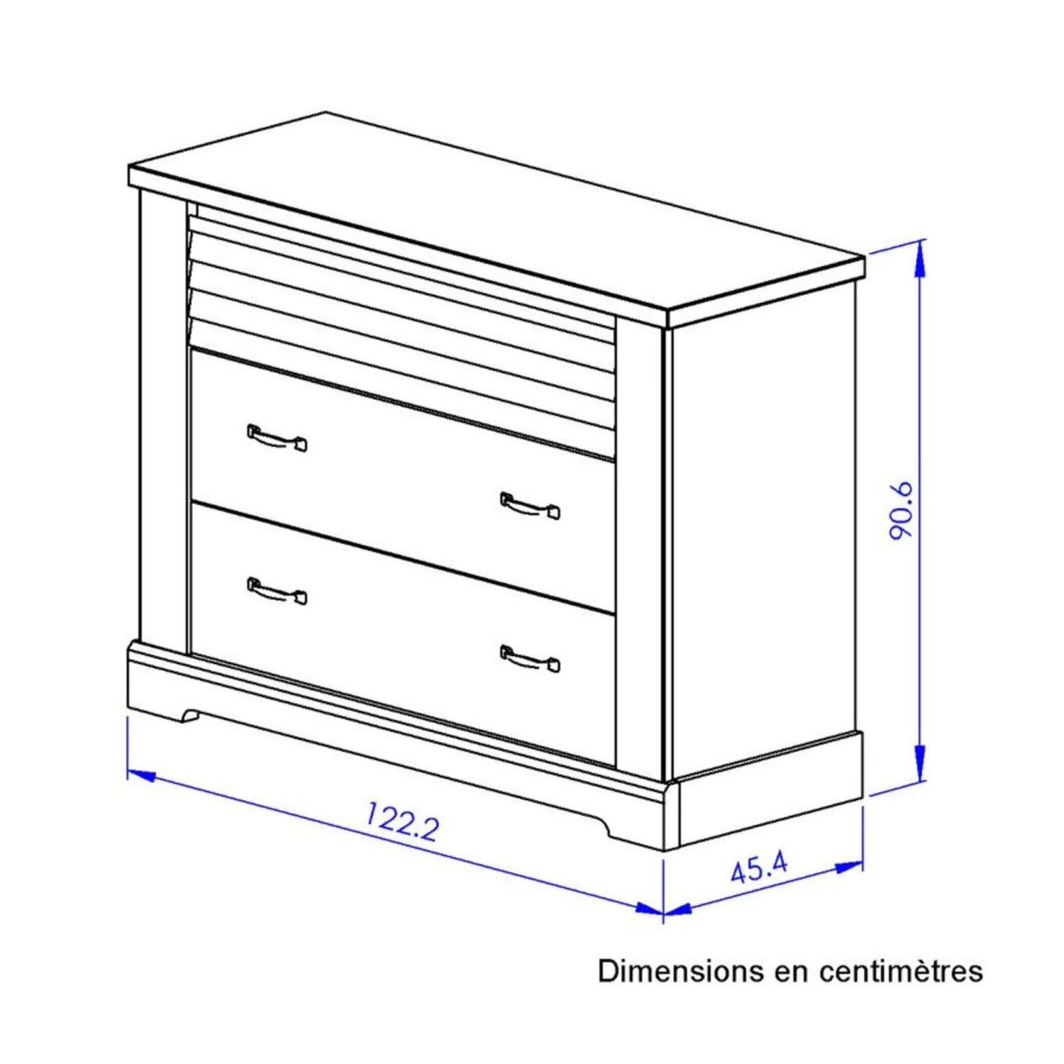 Une commode, idéale pour ranger vos affaires tout en apportant un esprit tendance à la décoration de votre chambre. Elle possède 3 tiroirs (93,8cm x 38,9cm x 12,6cm de hauteur) avec freins, dont 2 équipés de poignées finition métal et un avec façade imitation persienne vous offrant 3 beaux espaces de rangement. Sa structure en panneaux de particules est montée sur socle. Celle ci est couverte de papier décor ce qui lui donne ce style soigné.